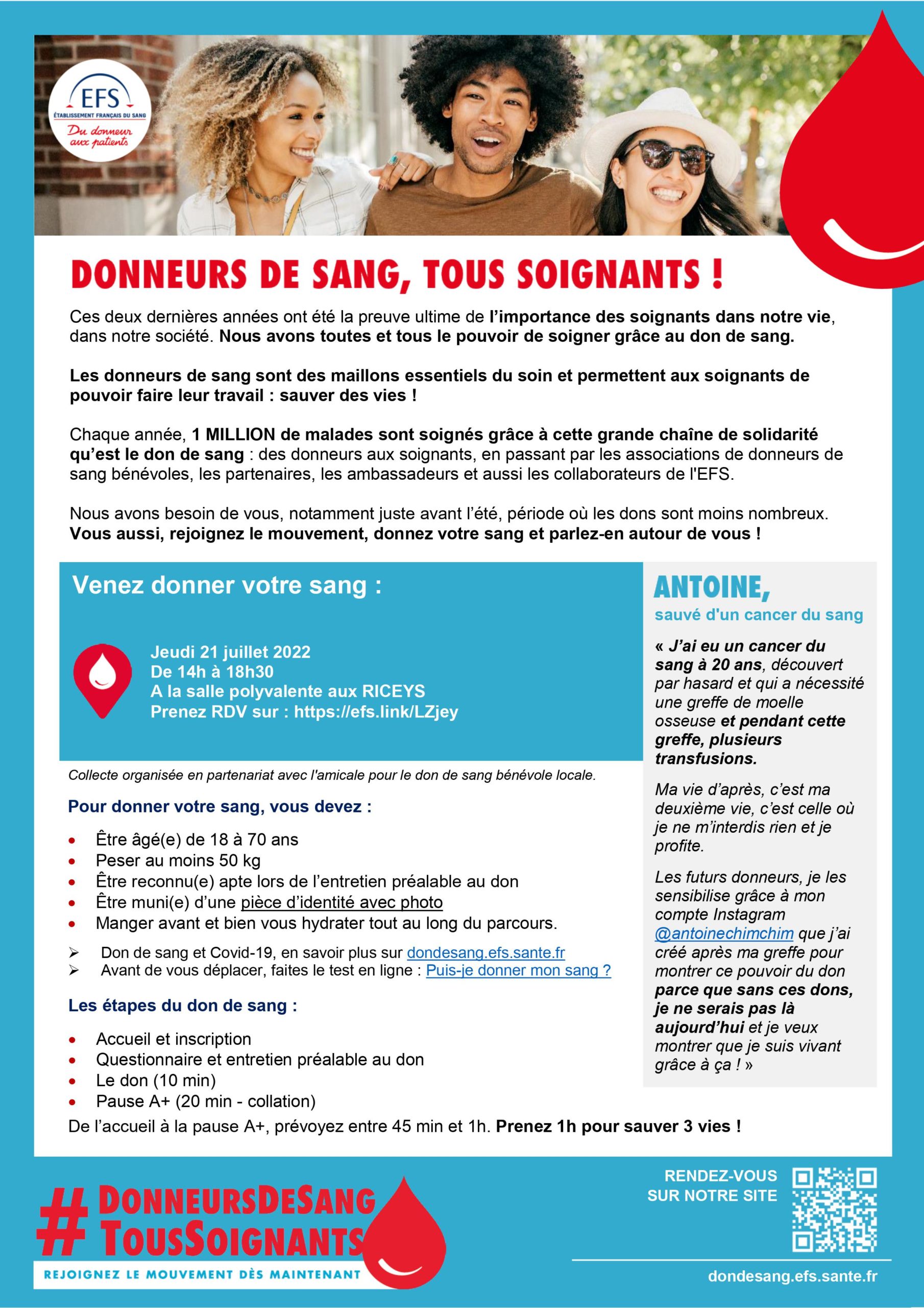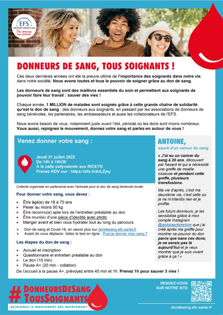 Une collecte de sang est organisée le jeudi 21 juillet 2022 de 14h à 18h30 à la salle polyvalente aux Riceys.