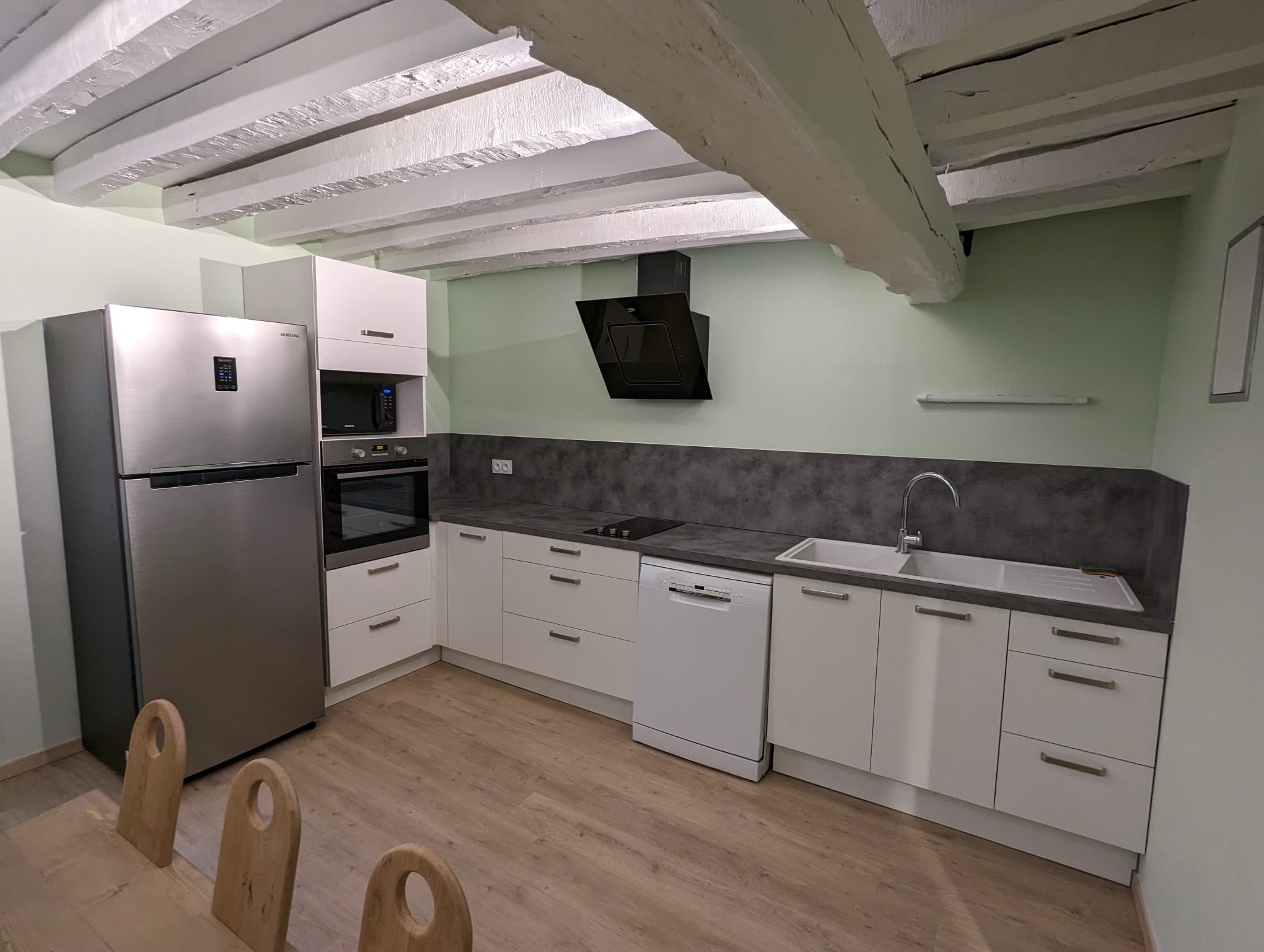 Un réfrigérateur et une plaque complètent l’aménagement de cette pièce, ainsi qu’un four et un micro-ondes. - Le gîte peut être loué dans sa totalité ou par chambre. En cas de location partielle (=par chambre) plusieurs groupes pourront être amenés à séjourner conjointement et partager les espaces communs (sanitaires et cuisine).