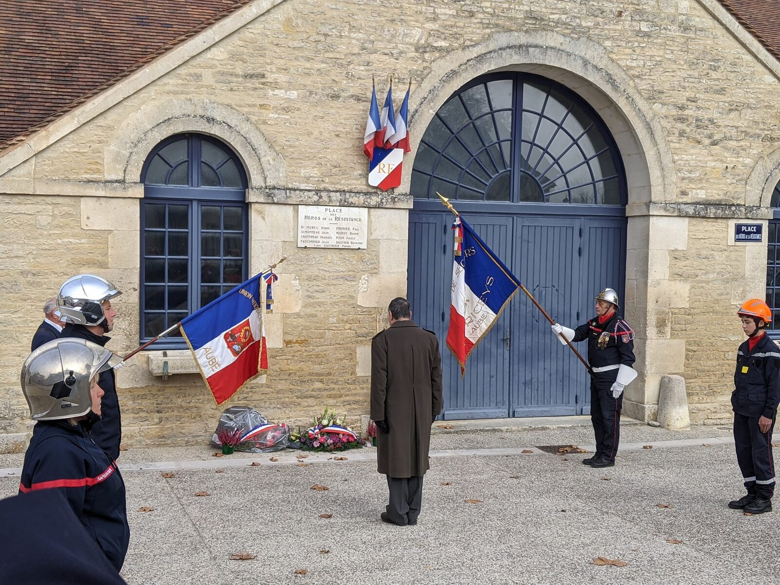 Monsieur Jean Gallimard, Président de la section UNC ACPG AFN, les portes drapeaux, Louis Ludinard et Patrice Romary (Souvenir Français des Riceys), l’adjudant chef de gendarmerie, Emmanuel Breuil, le commandant du centre de secours des Riceys, Christophe Chabot, les sapeurs pompiers, le Maire Laurent Noirot, les membres du conseil municipal et de nombreux habitants, étaient présents pour défiler et se recueillir devant le monument aux Morts et devant la plaque du souvenir apposée sur la halle.