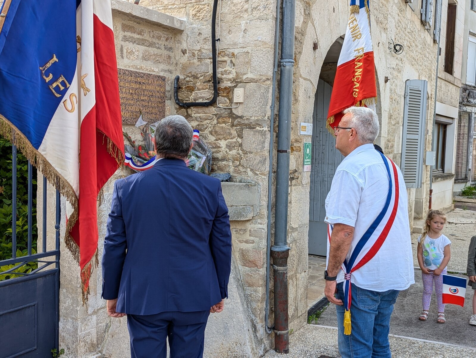 L’assemblée s’est ensuite déplacée devant une autre plaque commémorative, apposée à la mémoire du soldat Philippe de Hautecloque, qui deviendra le Général Leclerc, blessé à Magnant et soigné aux Riceys. Patrice Romary du Souvenir Français en a rappelé les détails dans son allocution avant de procéder à un autre dépôt de gerbe en compagnie des jeunes du SNU.